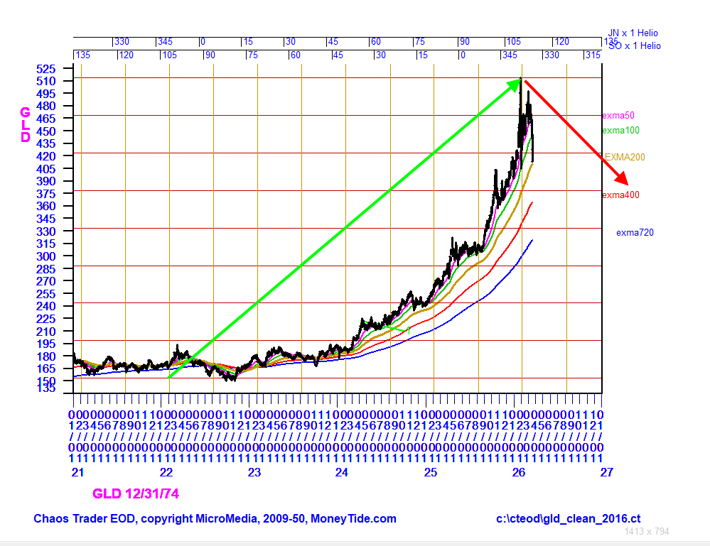 This chart of GLD, a gold Exchange Traded Fund, has topped. It is similar to the